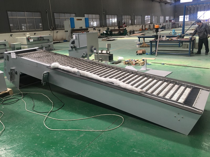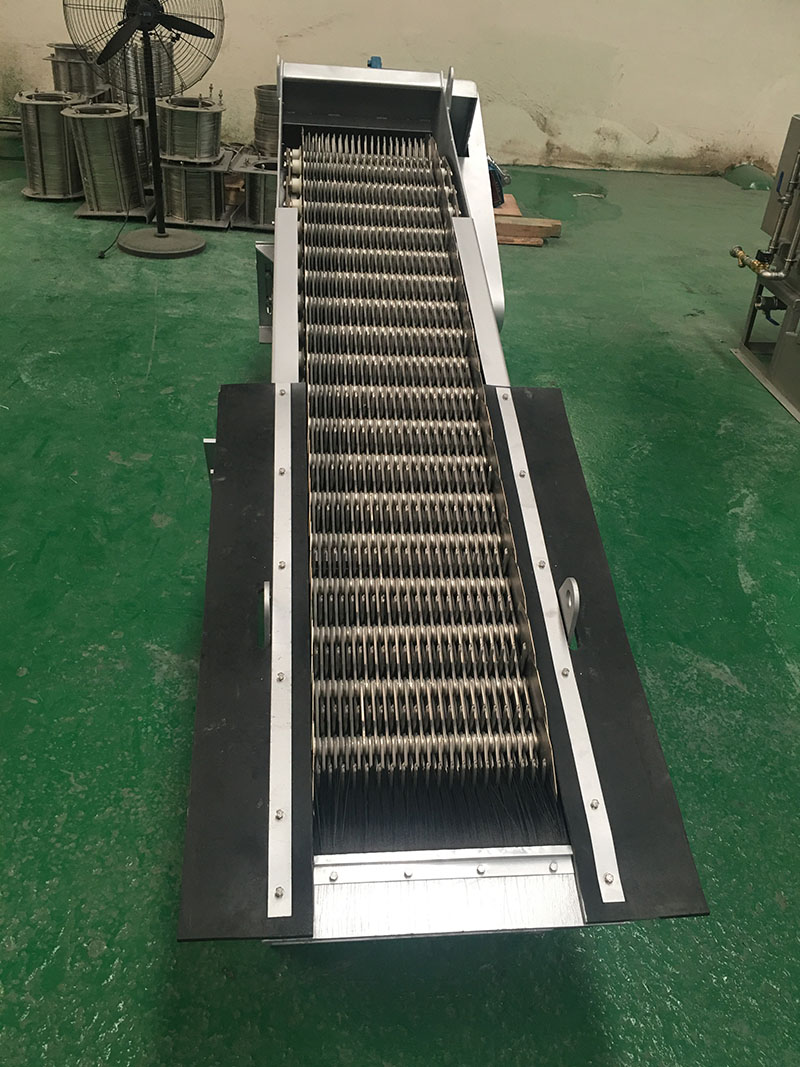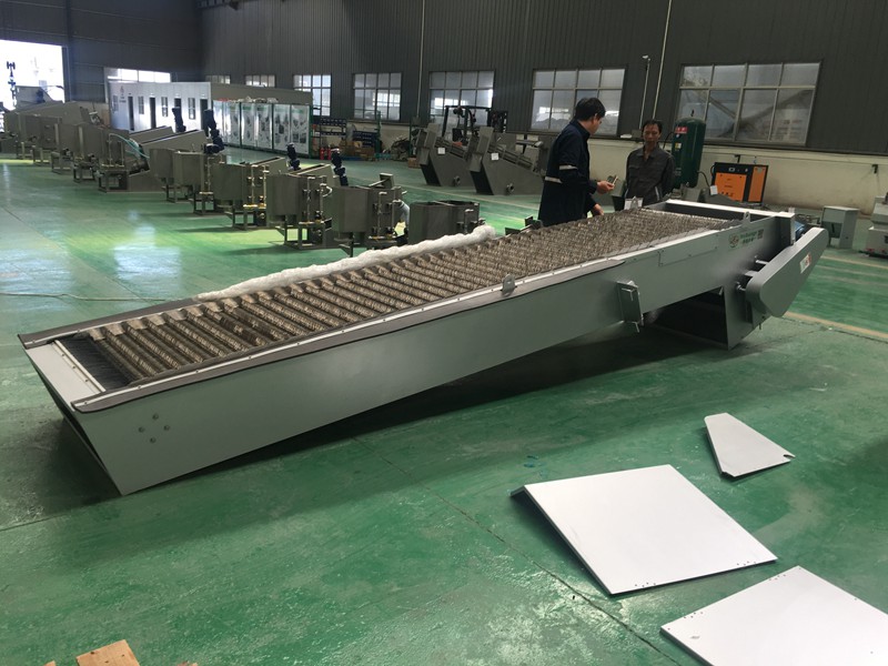 在链条轴上形成封闭式的环形齿耙链,整个耙齿链在传动链轮的驱动下自下而上做连续循环式运动,将截留在粑齿上的固体悬浮物从污水中输送到地面或平合上方,
